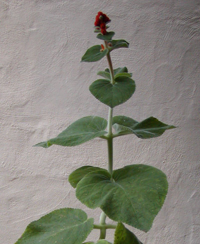 | Flower | Red, with galea. Purple fringe around corolla mouth (lower three lobes). Calyx is densely covered with red hairs, and closes up after corolla drops. |